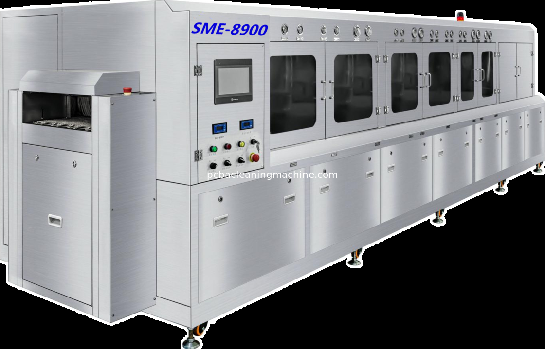 The SME-8900 is an integrated, fully automatic online spray cleaning system specifically designed for the removal of both organic and inorganic contaminants—such as rosin flux, no-clean flux, and other post-reflow and wave soldering residues—on the surfaces of printed circuit board assemblies (PCBAs). The system is widely adopted across industries including automotive electronics, military, aviation, aerospace, telecommunications, medical devices, Mini LED manufacturing, and intelligent instrumentation. It is particularly suitable for large-scale centralized cleaning applications, effectively balancing cleaning efficiency with cleaning performance.